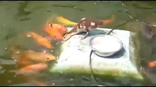 Утка кормит рыб)
